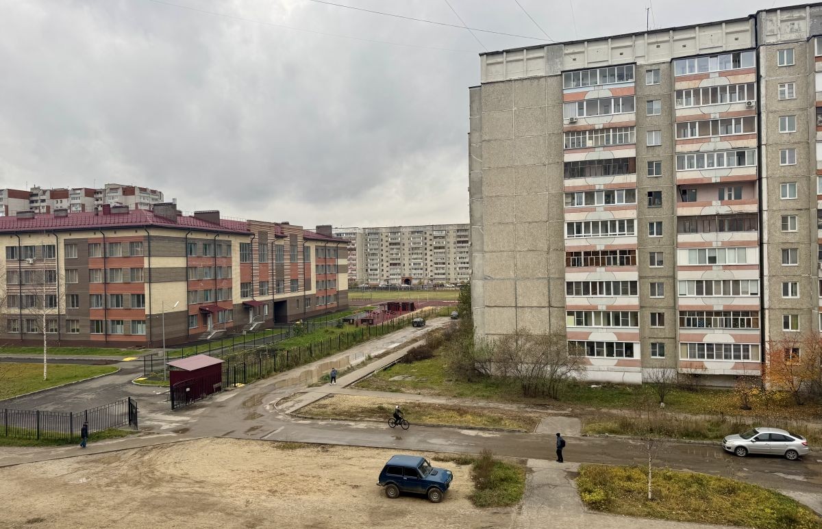 Спокойный зеленый двор с детской площадкой, большое количество парковочных мест для автовладельцев.