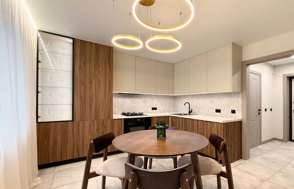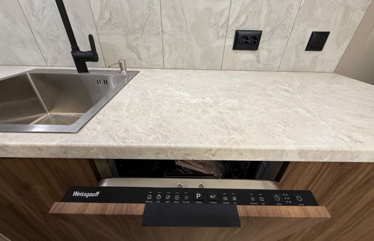Современный кухонный гарнитур выполнен в мягких, приятных, натуральных тонах, оснащен встроенной техникой: варочная поверхность, духовой шкаф, посудомоечная машина и вытяжка.