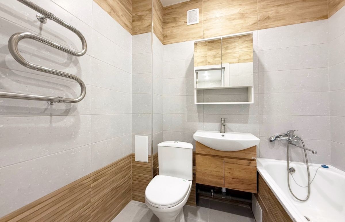 Санузел отделан современным кафелем в светлом оттенке.