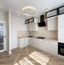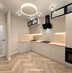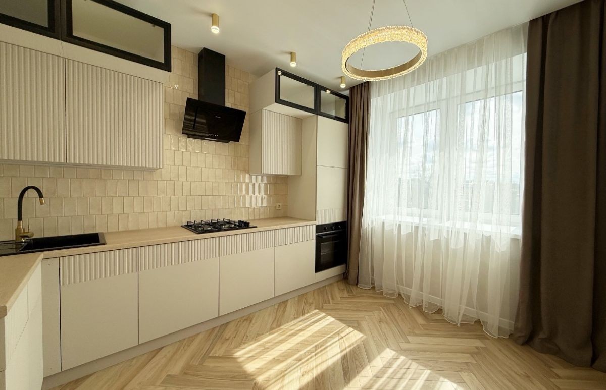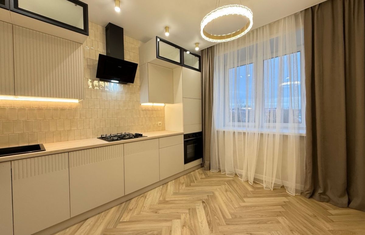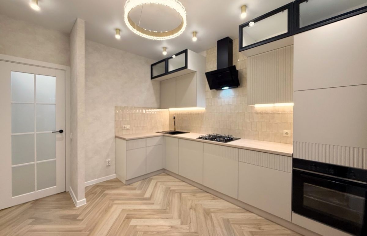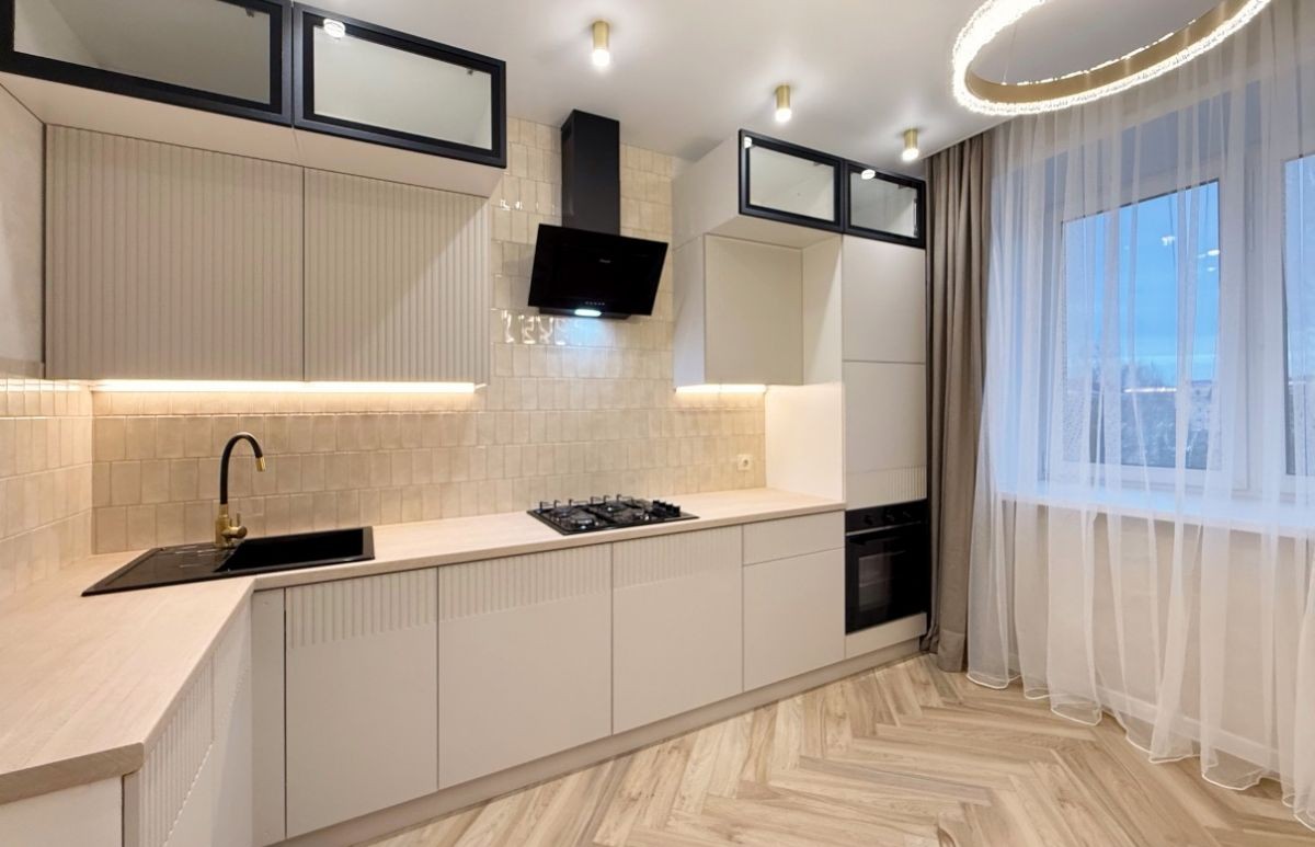 Современный кухонный гарнитур выполнен в мягких, приятных, натуральных тонах, оснащен встроенной техникой: варочная поверхность, духовой шкаф, вытяжка.