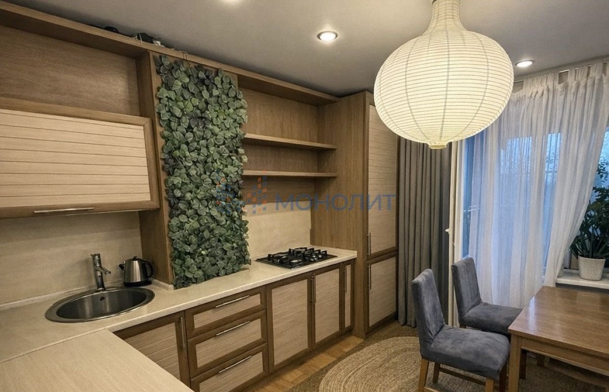 В просторной кухне остаётся кухонный гарнитур, встроенная техника, холодильник. Из кухни выход на утеплённую застеклённую лоджию с освещением.