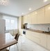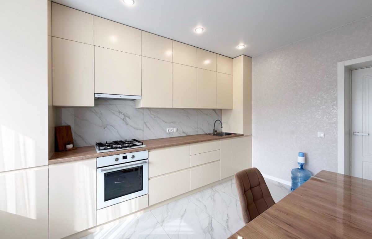 Современный кухонный гарнитур выполнен в мягких, приятных, натуральных тонах, оснащен встроенной техникой: варочная поверхность, духовой шкаф, вытяжка.