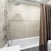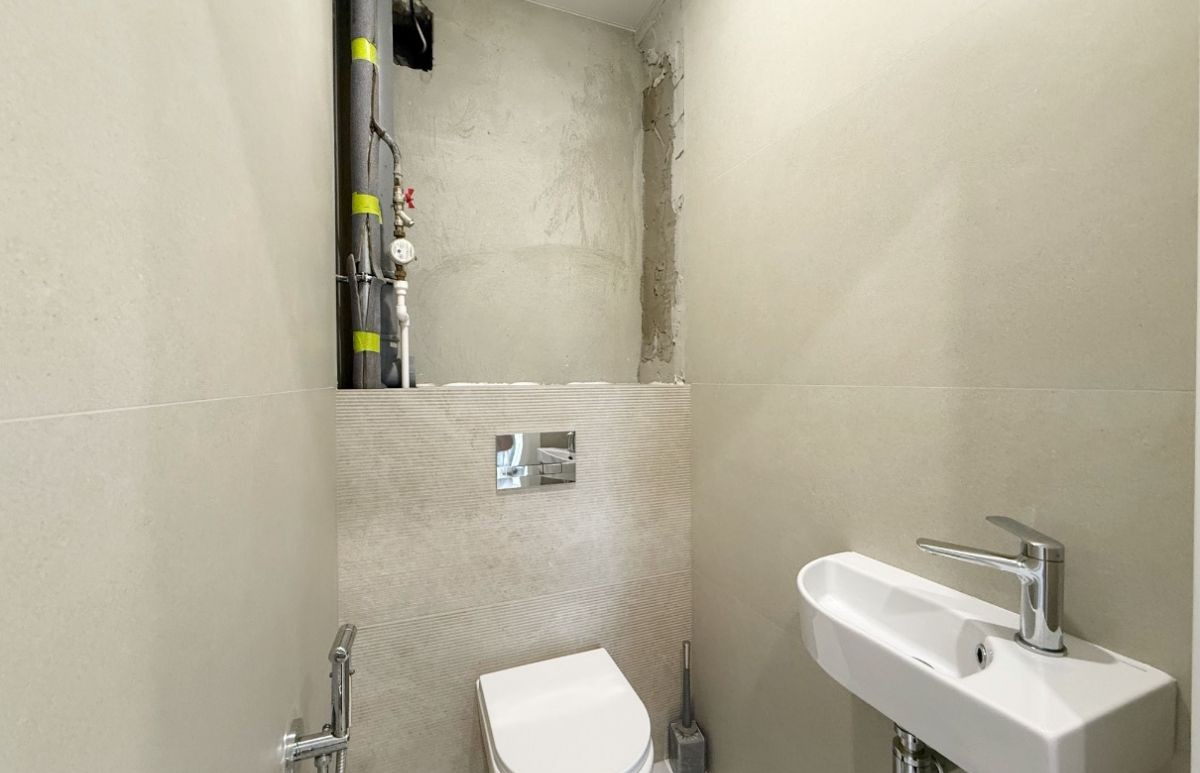 Раздельный санузел отделан современным кафелем в светлом оттенке.